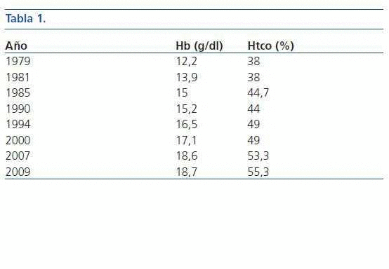 En las últimas revisiones se constata un aumento progresivo de la nefrocalcinosis, y de forma paralela existe un aumento progresivo de Hb y Htco con poliglobulia actual (tabla 1) y nivel de EPO normal (11,6 mU/ml).