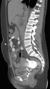 A 24 year old female patient was diagnosed with end stage renal disease during pregnancy. There was no other etiological factor, but hypertension. Patient was recommended 20hours of hemodialysis, but she refused and gave birth to a living child on the 38th gestational week. She has been on CAPD for the last 3 months. Since last week she has started to have abdominal pain accompanied with nausea and fever (>38°C). With these complaints she was referred to our policlinic and her peritoneal fluid cell count was found 4860/mm3 (95% polymorphonuclear leukocytes). Cultures were obtained and she was admitted to our hospital with the diagnosis of peritonitis. Blood analysis showed leucocytes 9000/mm3, hemoglobin: 8.8g/dl (11.5–16), C-reactive protein: 14.2mg/dl (0–0.5), sedimentation: 135mm/hour. Pseudomonas aeruginosa was detected in blood cultures. She was on empiric ceftazidime and cefazolin treatment and treatment was continued because P. aeruginosa was found sensitive to this treatment. Urine culture remained sterile. Patient stated that there is dialysate in her vagina. She was consulted with obstetrics and gynecology regarding any fistulas. A urine catheter was placed and it is understood that origin of dialysate was vagina. Contrast enhanced computerized tomography was done showing a vaginal fistula (Figs. 1 and 2). CAPD catheter was removed. Surgical operation was found unnecessary and hemodialysis was started. Patient was discharged after 3 weeks of ant biotherapy.