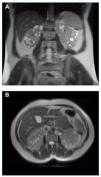 Figure 4. MRI of Case 2 showing enlarged kidneys, with multiple large cysts, a number of which show signs of intracystic haemorrhage (TRV=1322ml). A) Coronal view B) Axial view