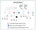 Varón de 16 años, que acude a urgencias por presentar un cuadro catarral de 1 semana de evolución que se acompaña de astenia, fiebre y visión borrosa. En los antecedentes personales destaca en la infancia la presencia de microhematuria y proteinuria aislada, con seguimiento ocasional e irregular por pediatría. Seis meses antes del presente cuadro presentó episodio de sinusitis maxilar, que no recibió tratamiento. En los antecedentes familiares (fig. 1) refería padre y 2 tíos paternos con microhematuria. También 2 familiares del abuelo materno fallecieron en diálisis.
