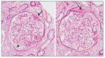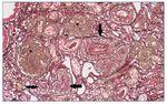Figura 5. Lesiones esclerosantes segmentarias con adherencia a la cápsula de Bowman (flecha) y área de hipertrofia podocitaria con formación de seudosemiluna (*). PAS ×20.