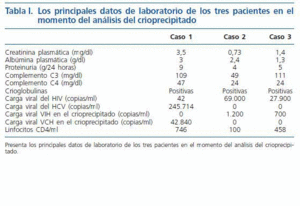 Para contribuir a resolver este problema hemos estudiado el crioprecipitado de pacientes VIH positivos con crioglobulinemia y glomerulonefritis membranoproliferativa (GNMP). Serológicamente, uno de ellos era positivo para VIH/VCH y 2 solo para VIH.