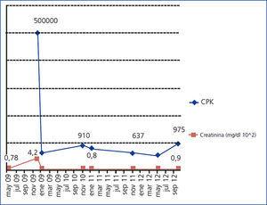 Figura 1. Evolución de la creatina fosfocinasa y de la creatinina en plasma
