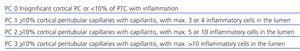 The presence and margination of inflammatory cells in peritubular capillaries is one of the histological markers defined in humoral rejection. Margination of polymorphonuclear neutrophils is the most accurate one, although the presence of neutrophils and mononuclear cells has been associated with C4d deposits in PTC.10,15,16 The Banff group, in its 2007 meeting,14 included a scoring system of peritubular capillaritis based on Gibson’s studies27 (Table 5). Several studies have confirmed the acceptability of this system and the association between high grades of capillaritis and antibody-mediated rejection.28,29 The grading must be carried out in the renal cortex, without assessing the medulla. Areas of pyelonephritis, areas next to infarcts and the vessels around aggregated lymphoid nodules must not be assessed either. The type of cells present must be stated (only mononuclear cells, minority or majority of neutrophils) and the extent of the capillaritis (> or <50%).