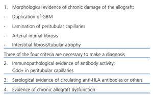 2. The studies carried out in the last few years have helped identify a series of histological lesions suggestive of antibody-mediated rejection such as capillaritis, glomerulitis or fibrinoid necrosis for acute rejection, and transplant glomerulitis, chronic vascular disease and multilamination of the basement membrane of peritubular capillaries for chronic rejection.