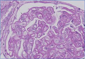 The diagnostic approach for chronic allograft failure (CAF) is complicated as there are many factors involved. These can be split into two groups: the immune factors (cellular or humoral) and the non-immune factors, including most importantly elderly donors, chronic ischemia, drug toxicity, hypertension, atherosclerosis and diabetes.42-45 It is important to distinguish between chronic rejection (CR), which must be limited to chronic allograft failure due to immunological causes, and chronic allograft dysfunction due to non-immunological causes for the prognosis and to offer a suitable treatment. This distinction is very often complex, as the histopathological features of the biopsies in this chronic period (interstitial fibrosis, tubular atrophy and glomerulosclerosis) are not very accurate and may be caused by immunological or non-immunological mechanisms. It is, therefore, important to determine the histopathological features that define CR and how they affect prognosis. The most characteristic histological findings of CR are chronic trasplant vasculopathy of the allograft, transplant glomerulopathy (TG) and peritubular capillary multilamination.46-55