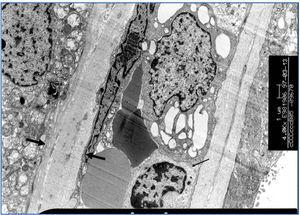 Peritubular capillary multilamination (transplant capillary disease) (Figure 6) is another of the histological findings to diagnose of chronic rejection.54,55 Its diagnosis must be very accurate48 and requires an ultrastructural study. Monga et al46,47 described the association between TG and multilamination of the basement membrane of the peritubular capillaries (PTC). Drachenburg et al57 have shown that TG is associated with a severe multilamination of PTC (more than six laminates), while less serious levels of lamination (2-3 laminates) can also be seen in other types of glomerular diseases, both in the native kidney and in the allograft.