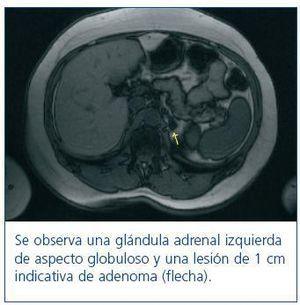 La ecografía abdominal y el Doppler renal fueron normales. Se inició tratamiento farmacológico con antagonistas del calcio y doxazosina, consiguiéndose un mejor control tensional, aunque insuficiente. En un segundo análisis se observó una aldosterona plasmática de 1.161 pg/ml y urinaria de 22,68 µg/24 h, con una actividad de renina plasmática basal de 0,6 ng/ml/h y un ratio aldosterona/renina de 193,3. El resto de los parámetros (catecolaminas en orina, hormonas tiroideas y cortisol plasmático) estaban dentro de la normalidad. En función de la sospecha de un hiperaldosteronismo primario (HAP), se realizó un test de sobrecarga salina con la administración de 2 litros de suero fisiológico en 4 horas. No fue necesaria la modificación previa del tratamiento; sin embargo, conviene recordar que es recomendable suspender los IECA, ARA-II, betabloqueantes y diuréticos con antelación1. Tras la sobrecarga salina no se suprimió la aldosterona, siendo de 27,6 ng/dl (normal si <10 ng/dl). Se confirmó un HAP como etiología de su HTA secundaria y se inició tratamiento con espironolactona, consiguiendo mejor control tensional y alivio de su astenia. Se completó el estudio con la realización de una TAC con contraste y posterior resonancia magnética, que revelaron un adenoma de 1 cm en la glándula suprarrenal izquierda (figura 1).