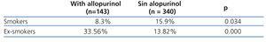In conclusion, patients who take allopurinol smoke less and it is more likely that they are ex-smokers. Given that these findings are merely descriptive, well-designed studies that support this observation would be necessary. While these studies are being implemented, we thought it would be interesting to communicate this to the scientific community, since this finding could be yet another beneficial effect of allopurinol administration.