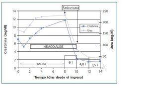 En el caso 1 encontramos además una marcada hiperuricemia que llevaría a postular que el fracaso renal agudo sería debido a precipitación intratubular de ácido úrico. La recuperación de la función renal en estas patologías es más lenta, con volúmenes de diuresis creciente día a día, y con descensos graduales de los productos nitrogenados en sangre,3 pero no con la brusquedad con que lo hizo en este caso.