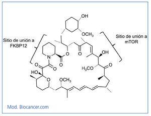 Entre 1982 y 1988, la rapamicina se desarrolló como un agente inmunosupresor. Gracias a estos estudios se dilucidó el mecanismo de acción de esta molécula. La rapamicina, a través de su grupo metoxi, interactúa con la proteína de unión a la inmunofilina FK506 (FKBP12). El complejo rapamicina-FKBP12 se fija específicamente a la proteína mTOR inhibiendo las rutas de señalización efectoras dependientes de dicha proteína14. La rapamicina inhibe la proliferación de las células T inducida por antígeno y las respuestas proliferativas inducidas por citoquinas, incluyendo interleuquina 16 (IL-16), immunoglobulin growth factor (IGF), etc. Sigue la vía del citocromo Cyp450 3A4 como el principal sistema responsable de la biotransformación del fármaco, generando metabolitos inactivos.