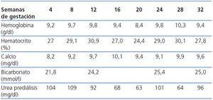 Se utilizó como dializador una membrana de polietersulfona de alta permeabilidad con una superficie de 2,1 m2, y un baño de diálisis con una composición de 3 mEq/l de calcio y 1,5 mEq/l de K+, aunque fue variando dependiendo de los datos analíticos. La anticoagulación se realizó con dalteparina a dosis inicial de 2500 UI por sesión. El peso seco se fue ajustando, incrementándolo a razón de 0,3-0,5 kg por semana a partir del segundo trimestre.