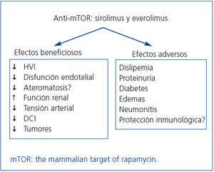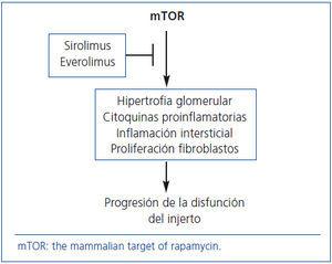 Los fármacos anti-mTOR, sirolimus (SRL) y everolimus (EVE), son potentes inmunosupresores con capacidad antiproliferativa y antimigratoria por bloqueo de la señalización intracelular que regula el crecimiento y la proliferación de las células T2. Esto les confiere un potencial papel protector en la disfunción del injerto renal, al mismo tiempo que pueden optimizar el perfil cardiovascular y reducir la aparición de tumores de novo. Sin embargo, sus efectos secundarios pudieran contrarrestar estos beneficios a más largo plazo (figura 1).