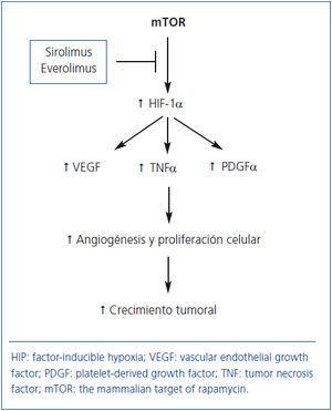En general, tras el TX existe un incremento en la incidencia de tumores y los ICN desempeñan un papel crucial en su desarrollo68. La proteína mTOR estimula la producción de factores de crecimiento (VEGF, PDGF-α, TNF-α) que incrementan la angiogénesis, la proliferación celular y el crecimiento tumoral (figura 3). De ahí que SRL y EVL puedan frenar potencialmente el desarrollo y el crecimiento de las células neoplásicas69. En esta línea, un estudio observacional del registro americano de más de 30.000 pacientes demostró que los tratamientos inmunosupresores que incluían SRL o EVE disminuían un 60% el riesgo de cáncer cutáneo y no cutáneo frente al tratamiento con ICN70. Un análisis por intención de tratar de un ensayo clínico aleatorizado demostró que la incidencia de carcinomas cutáneos y no cutáneos fue inferior en los pacientes que recibieron SRL frente a aquellos que recibieron CsA más SRL, pero el grupo control recibió una inmunosupresión más potente, lo cual constituye un sesgo importante para valorar el efecto antitmoral de los fármacos anti-mTOR71. Como se comentó previamente, en el estudio CONVERT se observó una menor incidencia de tumores en los pacientes que fueron convertidos de un ICN a SRL33. Por último, un ensayo controlado más reciente en enfermos con neoformaciones cutáneas no melanocíticas demostró que el tratamiento con SRL puede retrasar el desarrollo de nuevas neoplasias e inducir regresión de lesiones preexistenes frente a aquellos enfermos que recibieron CsA72 (nivel moderado de evidencia).