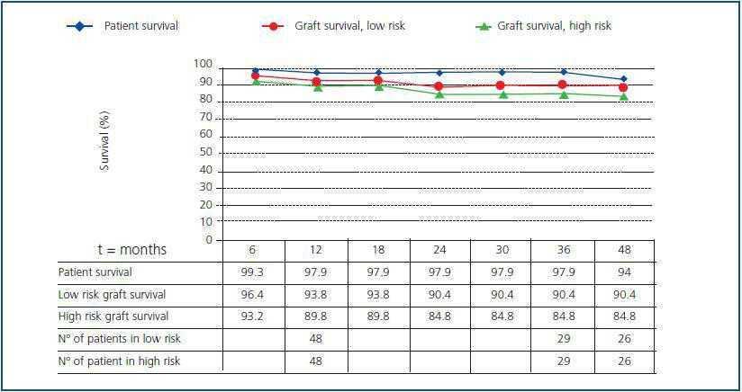 Three patients died in the high risk group: two with functioning graft at 12 and 53 months, and the third at 42 months after chronically having lost his graft at month 4. Other 5 recipients lost their grafts, one of them due to acute rejection and the other at 4, 5, 17 and 24 months chronically; one of them due to non-compliance with treatment.