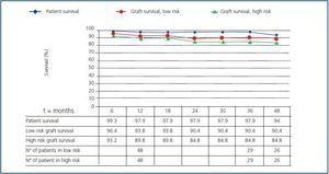 Recipient survival was 97.9% at 12 and 36 months in both groups, and the graft survival was 89.8% and 84.8% in the high risk group against 93.8% and 90.4% in the low risk group at 12 and 36 months (figure 1), with no significant differences observed.