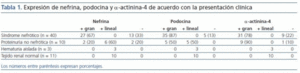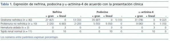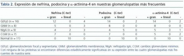 La expresión fue variable, con algunos casos de pérdida de la expresión de nefrina o de α-actinina-4. No hubo casos con pérdida de la expresión de podocina. En cuanto al patrón de expresión (lineal o granular), éste fue variable, con algunos casos lineal y otros con aspecto granular similar al encontrado en casos con proteinuria nefrótica (tabla 1).