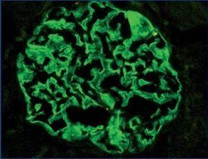 La inmunotinción fue evaluada en las paredes de capilares glomerulares y su intensidad fue evaluada subjetivamente por comparación con los controles de tejido renal normal; se registró el patrón de inmunotinción: lineal o granular, y homogéneo o irregular (heterogéneo en diferentes áreas del glomérulo). Se analizaron imágenes estáticas de todos los casos positivos con Phothoshop®, versión 10, para determinar la relación de la inmunotinción con la membrana basal glomerular.