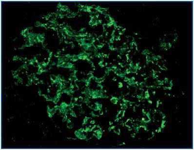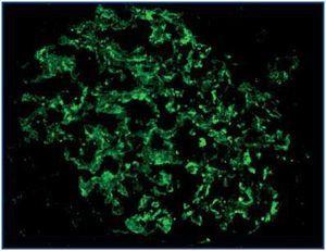Immunostaining was evaluated on the walls of the glomerular capillaries and its intensity was subjectively evaluated by comparison with the controls of normal kidney tissue. The immunostaining pattern was recorded: linear or granular, and homogeneous or irregular (heterogeneous in different areas of the glomerulus). Static images were analyzed for all positive cases with Photoshop®, version 10, to determine the relationship of the immunostaining with the glomerular basal membrane.