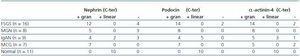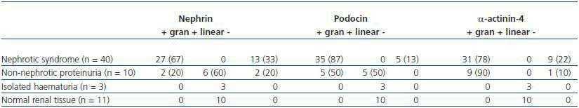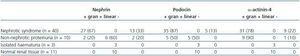 The expression was variable, with some cases of loss of expression of nephrin or α-actinin-4. There were no cases with loss of expression of podocin. The expression pattern (whether linear or granular) was variable, with some cases linear and others granular, with an appearance similar to that found in cases with nephrotic proteinuria (Table 1).