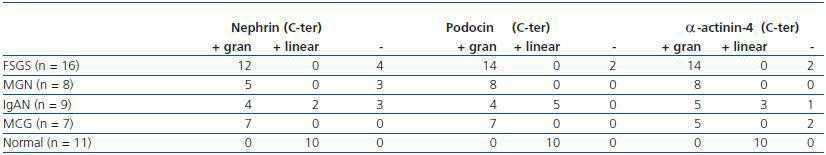 The intensity of immunostaining varied somewhat between cases, but this variation was completely subjective as we did not have a system to quantify the intensity. In addition, this may vary according to the light exposure of each microscopic field, due to progressive loss of fluorescence with photoexposure. In segmental sclerosing lesions, it was common to find a loss of protein expression associated with filtration diaphragm. No expression was detected in extraglomerular sites for any of these proteins in any of the samples studied.