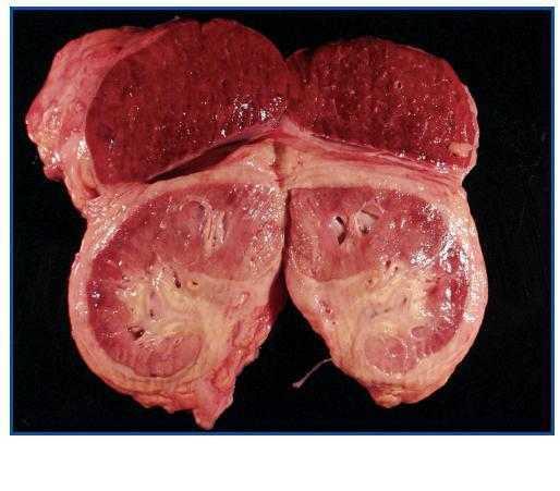 La necropsia demostró un proceso fibrosante sistémico (Figuras 1-4), con afectación de pelvis menor, retroperitoneo, en coraza alrededor de riñones, glándulas suprarrenales y páncreas, abarcando espacio periesplénico y perihepático; y mediastínico, en coraza alrededor de pericardio, arco aórtico y grandes vasos; y paquipleuritis derecha con fibrosis calcificada. Se apreciaron también: pancreatitis crónica fibrosa asociada, atrofia testicular, fenómenos de enfermedad aterombólica, hipertrofia ventricular izdª, y hepatopatía fibrosa crónica, en el contexto de un paciente con arteriosclerosis generalizada severa, con repercusión renal -nefroangiosclerosis bilateral con atrofia renal derecha, encefálica –infarto antiguo quístico izquierdo a nivel de ínsula-, y de colon –colitis isquémica rectosigmoide.