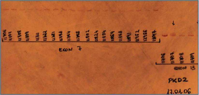 Exons of the PKD2 gene were then amplified by PCR. Exon 1 was not amplified due to difficulties found in PCR amplification because of abundance of guanine and cytosine.