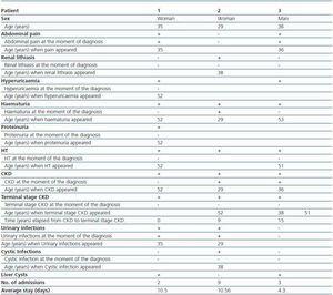 Of the 3 live patients affected, 2 were women and 1 was a man. Diagnosis mean age was 33 ± 3.79 years. (table 1). Renal failure, present in 100% of mutation carriers was the disease presenting symptom in two of them; other symptoms at the moment of diagnosis were abdominal pain (2 patients), macroscopic haematuria (1 patient) and urinary tract infections (2 patients). As disease progressed the patients developed renal lithiasis (1 patient), hyperuricaemia (2 patients), haematuria in 100% of the patients with a mean age occurrence of 51.5 ± 0.71 years, HT in 100%, and terminal stage chronic kidney disease (CKD) in 100%, with mean age occurrence of 35.25 ± 24.35 years and time elapsed from diagnosis of CKD of 4.8 ± 6.91 years. The only extra-renal manifestation was 2 of the 3 patients affected who presented with liver cysts detected by ultrasound at the moment of diagnosis (table 1).