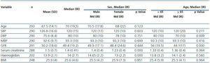 None of the clinical markers presented a normal distribution except for haemoglobin; the median glomerular filtration rate (GFR) was related to stage 3 CKD, which was the most common stage, and there was a significantly different tendency with a larger proportion of patients in advanced stages for the group aged 65 and older. Women showed significantly lower median creatinine serum values; haemoglobin was at a clinically normal average level, and the median body mass index was in the overweight range. (Table 1).
