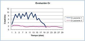Figura 2. Comparación de la evolución de las cifras de creatinina de los pacientes.