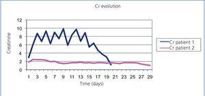 Figure 2. Comparing evolution of creatinine figures in two patients.