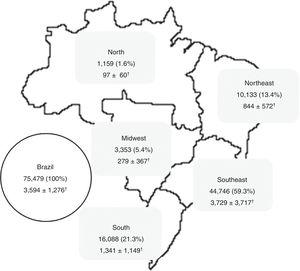 However, there was a significant regional disparity in the total and average number of transplants performed. While the Southeast region had a mean KT (3729±3717) higher than the national average (3594±1276) and was responsible for 59.3% of surgeries for this purpose between 1995 and 2015, the quantitative effect in northern and in the same period, it was small and represented 1.6% and 5.4% of the total, respectively (Fig. 1). In fact, this fact can be influenced by the great territorial extension of the country. The northern region, for example, is the most extensive of the five Brazilian regions. The State of Amazonas, with its more than 1.5 million square kilometers, has an area greater than the extension of the territories of the south and southeast regions together,11 as well as superior to the territories of several nations. Another issue, which may also have an impact on geographical differences, is the population contingent.