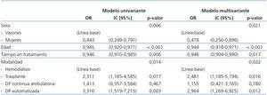 La tabla 1 muestra los principales resultados. Podemos ver que la proporción estimada de pacientes en edad laboral que se encuentran ocupados es del 33,3%. Las cuatro variables basales consideradas (sexo, edad, tiempo en tratamiento y modalidad de diálisis) están muy relacionadas con la ocupación laboral del paciente.