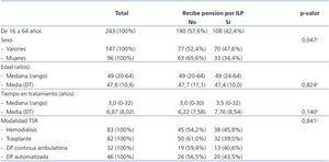 En lo relativo a la situación de ILP, de los 243 pacientes en edad laboral, 103 reciben una pensión por ILP, lo que da lugar a un porcentaje estimado del 42,4%, con un intervalo de confianza al 95% de entre 36,1 y 48,6%. Únicamente se observan diferencias significativas en relación con el sexo del paciente (tabla 3).