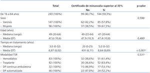 En cuanto al porcentaje de pacientes en edad laboral (de 16 a 64 años) con un certificado de minusvalía superior al 33%, podemos observar que 144 de los 243 pacientes en edad laboral tienen un certificado de este tipo, lo que da lugar a un porcentaje estimado del 59,3%, con un intervalo de confianza al 95% de entre 53,0 y 65,5%. Únicamente se observan diferencias significativas en relación con el tiempo en tratamiento del paciente (tabla 4).