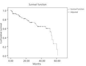 Mean catheter survival during this period was 42 months, with a 95% confidence interval of 36.8-58.7 months (Figure 1).
