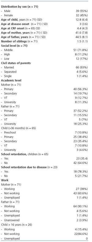 Transversal study whose accessible population was children seen in the Children’s Nephrology Section of the Gregorio Marañón University Hospital (Madrid) included 71 CKD patients (more than 3 months of evolution), 22 in conservative treatment, 33 carrying a kidney graft and 16 in replacement treatment: 11 on PD and 5 on HD. All patients participated voluntarily in the study, giving consent for inclusion after previous verbal explanation. We used the QL questionnaire specific to children with kidney disease (TECAVNER) developed by us and described in detail in an attached study.7 It consists of 14 domains. It has a reliability of 0.92 using Cronbach’s coefficient alpha. Its main limitations stem from not having undergone the testretest nor construct validity. It is answered by children older than 9 years of age and their parents independently, and by only the parents of children under 9. Data collected were: a) sociodemographic variables: age, civil status, education and working situation of parents, social level, type of housing, number of siblings, job situation in working-age patients, education and school delay and, b) clinical data: age of patients, age at disease onset and its evolution time, baseline diagnosis of the disease and current treatment type. In the statistical analysis, the description of quantitative variables is expressed as mean and standard deviation (SD) and qualitative variables as a percentage or frequency. A simple or bivariant analysis was done to demonstrate associations, using the χ2 test for qualitative variables and, where that was not possible, the Fisher exact test. To compare the means of independent groups, the non-parametric version of ANOVA (Kruskal-Wallis) was used when the sample was less than 30 or the variances were not homogeneous. We determined the reliability of the questionnaire using Cronbach’s coefficient alpha. Concordance between the answers of children over 9 with their parents’ answers has been analysed using the intraclass correlation coefficient with its ICC at 95%. This coefficient is used to determine agreement between two distinct groups which use the same scale. Values over 0.9 indicate excellent agreement and values of 0 indicate total disagreement.