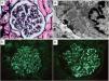 We present the case of a 58-year-old woman with a history of Crohn’s disease diagnosed in 2016, requiring hemicolectomy at onset and treatment with adalimumab. The patient consulted for oedema, nephrotic syndrome was documented with serum Cr of 0.6 mg/dl, proteinuria of 4.2 g/24 h, albumin of 2.7 g/l and sediment with 3–5 RBC/HPF. Complete blood count, liver and thyroid profile were normal. The autoimmunity study showed positive ANA (1:320) and ENA, with complement, anti-PLA2R, anti-DNA, rheumatoid factor, ANCA, cryoglobulins and viral serologies normal. A renal biopsy was performed and 15 glomeruli were obtained, none of them sclerotic. All glomeruli showed mild mesangial matrix expansion without associated cell proliferation. With methenamine silver (Fig. 1) and PAS staining, the glomeruli showed thickened basement membranes, without clear images of double contours. The direct immunofluorescence (DIF) study on the frozen section was negative for the antisera studied (IgG, IgA, IgM, C3, kappa and lambda). The interstitium and vascular structures were normal. Congo red and thioflavin were negative. The immunohistochemical study for C4d and DIF for anti-PLA2R were also both negative. Electron microscopy showed electron-dense deposits in the subepithelial area of the basement membrane and diffuse pedicellar fusion (Fig. 1B). In view of these findings, DIF was repeated on frozen tissue, which was also negative, and the study was completed with DIF on pronase-digested paraffin sections, which documented immune deposits of IgG (+++) and kappa (+++) with a granular pattern (Fig. 1C and 1D), in a subepithelial arrangement. The pathology diagnosis was membranous glomerulonephritis with masked monotypic IgG-kappa deposits. The study was completed with urine and serum immunofixation electrophoresis, which showed no free paraprotein, and a whole body CAT scan was performed with no relevant lesions. After diagnosis, treatment with ACE inhibitors was started, and the patient continued with her background immunosuppressive treatment for inflammatory bowel disease. Four months after onset, the patient experienced a progressive decrease in proteinuria compatible with a spontaneous partial remission, which still persists.