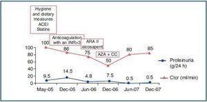 In 2006, given the new deterioration of renal function (CrCl 50ml/min), the possibility of immunosuppressant treatment was agreed with the patient and his family. Empirical treatment was begun with prednisone 0.5mg/kg/day and azathioprine 100mg/24h. The patient demonstrated a progressive decrease in proteinuria. Six months after beginning immunosuppressant treatment, proteinuria was 0.5g/24h with a CrCl of 80ml/min; thus the azathioprine was withdrawn, with just 10mg/24h steroids remaining.4,5