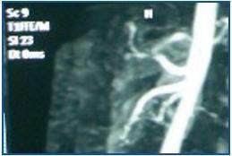 Six months later the patient suffered a superficial phlebitis of the right lower extremity with deterioration in renal function (CrCl 86ml/min) and an increase in proteinuria, passing from 9 to 14.5g/24h. An angio-MRI was carried out which confirmed stenosis of the right renal artery, thus increasing the INR to >3. The stenosis was not evident in a follow-up x-ray (figure 2).