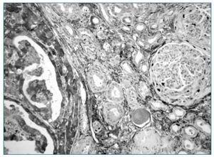 En diciembre de 2005 ingresó por anuria, edemas y dolor infraabdominal, mostrando deterioro agudo de Creatinina (3,5 mg/dl), proteinuria de 4,2 g/24 h y hematuria de 100 h/c, precisando de hemodiálisis temprana. Se obtuvo una nueva biopsia informada como esclerosis sobre el 50% de los glomérulos presentando la mayoría de los restantes una GN extracapilar con semilunas epiteliales, asociada a GM, con moderada fibrosis intersticial. En los estudios de imagen se encontraron imágenes sugestivas de EQA, destacando un nódulo sólido de 2,5 cm en polo superior del riñón derecho, con sospecha de malignidad, por el que sufrió nefrectomía.
