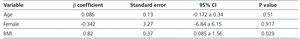 Only BMI was significant in the prediction of the performance of the CKD-EPI formula (β 0.82, 95% CI 0.085 to 1.56; p=.029). Neither age nor sex displayed a significant value in the formula performance (Table 5).