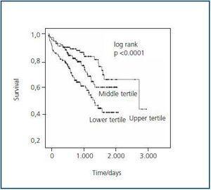 Table 2 shows the characteristics for patients grouped by apo A tercile. We observe significant differences for sex, comorbidity index and levels of C-reactive protein among the three groups. Women were predominant (78%) in the patients grouped in the upper tertile for apo A, which had a lower incidence rate of associated diseases and above all, for diabetes mellitus (19% compared to 40% in those grouped in the lowest tertile for apo A). Patients grouped in the lowest tertile had significantly higher levels of C-reactive protein than the rest of the subgroups. Patients with higher apo A concentrations also had higher levels of total cholesterol, HDL and LDL. No differences in the proportion of patients treated with statins were found among the three subgroups.