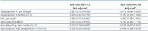 When the variable apo A is introduced in the multivariate model in the form of distribution frequency tertiles, statistical significance was not reached (RR = 0.784; 95% CI: 0.610-1.009; p = 0.059).
