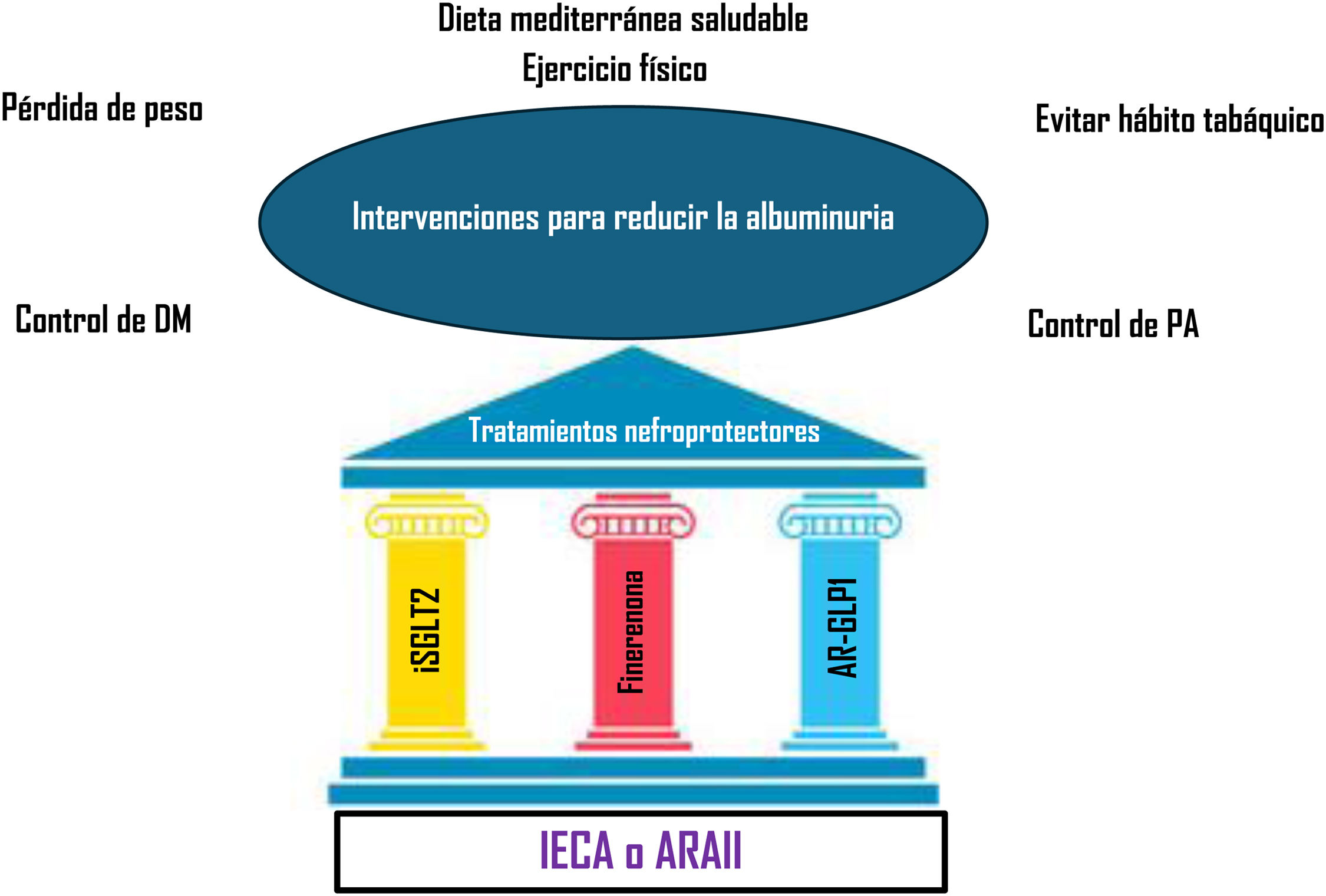 ARA II: antagonistas de los receptores de angiotensinaII; GLP1: péptido similar al glucagón tipo1; IECA: inhibidores de la enzima convertidora de angiotensina; iSGLT2: inhibidores del cotransportador de sodio-glucosa2; PA: presión arterial; RM: receptor mineralocorticoide.