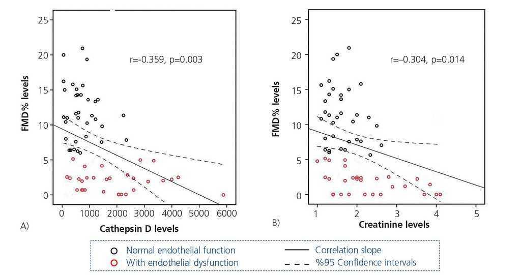 In conclusion, in addition to classical risk factors for the development of endothelial dysfunction, cathepsin D, which is known to be related to atherosclerosis, may play a role in the process of endothelial dysfunction. Further controlled and large-scale experimental and clinical studies are required to prove the exact function of cathepsin D in endothelial dysfunction in chronic kidney disease and to determine its value as a tool for early diagnosis and target for treatment of cardiovascular diseases in patients with chronic kidney disease.
