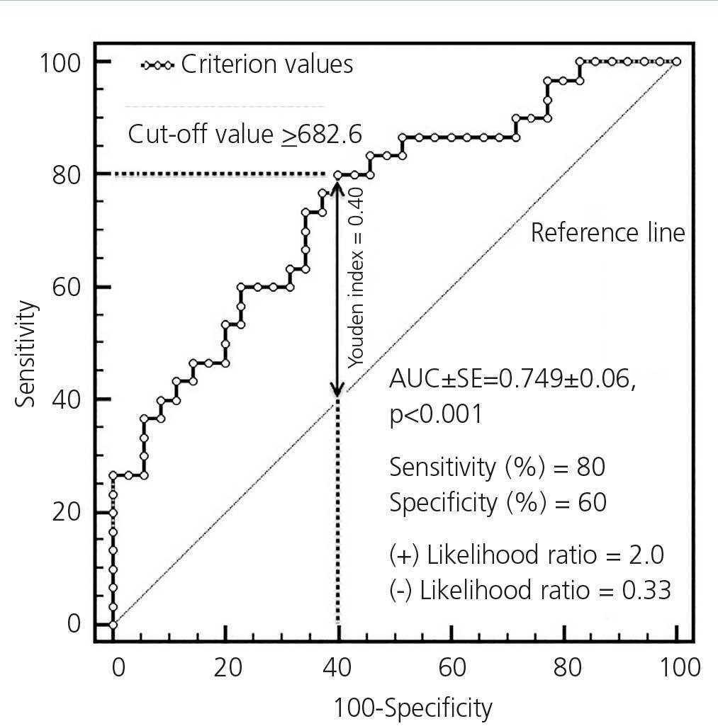 Stepwise multiple robust regression analyses were performed to evaluate the predictors of FMD percentage levels. In regression analysis, cathepsin D was found to be an inverse predictor of FMD percentage (B+SE=-2.338±0.840, p=0.023). Among the risk factors influencing FMD percentage, it was established that a one-unit change in creatinine led to a 2.338-fold decrease in FMD percentage. Similarly, stepwise multiple logistic regression analyses were performed to evaluate predictors of endothelial dysfunction. In regression analysis, cathepsin D was found to be an inverse predictor of endothelial dysfunction (odds ratio = 1.100; 95% confidence interval = 1.045–1.218, p=0.010) (Table 4). It was determined that cathepsin D>682.6 predicted the decrease in FMD with a sensitivity of 80% and specify of 60% (AUC±SE=0.749±0.06, p<0.001) (Figure 2).