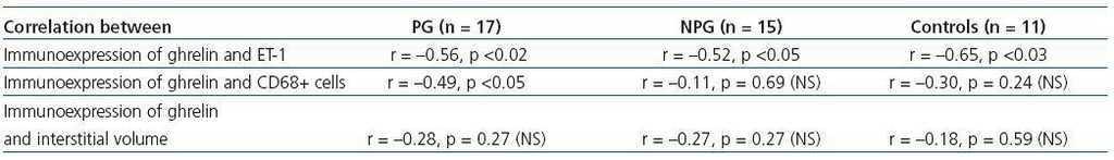 Table 1. Renal immunoexpression of ghrelin, ET-1, and analysis of interstitial volume as well as CD68+ cells in PG, NPG and controls