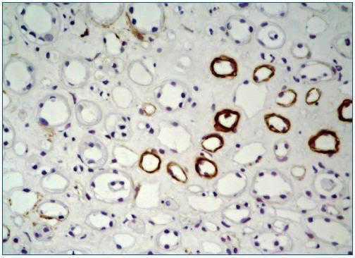The reports on ghrelin in a kidney tissue are very scanty. In study of Gheraldoni et al. Ghrelin was not detectable in the kidney15. Mori et al.16 demonstrated the ghrelin immunoreactivity in the mouse kidney which was much more abundant then that in the mouse plasma. They concluded that ghrelin is produced locally in the kidney and suggested the possible endocrine and/or paracrine role of this peptide. Although these authors found that ghrelin gene was expressed in glomerulus and renal cells, in our study the glomeruli showed no ghrelin immunoexpression in all cases investigated, whereas epithelial tubular cells were focally positive. Similarly, Dagli et al.2 noticed ghrelin immunoexpression in tubular epithelium of human normal kidney, but glomeruli were absent from ghrelin immunoreactivity. In the kidneys of normal rats, mice, hamsters and diabetic rats positive ghrelin immunoexpression was observed in distal tubular epithelium17,18. There was no positive staining in the proximal tubules and glomeruli. However, to the best of our knowledge, this is the first study of ghrelin immunoexpression in human glomerulopathies.