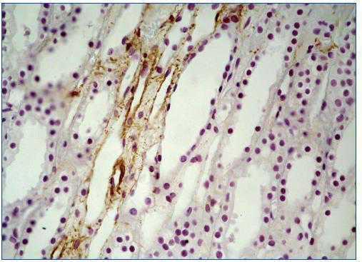Figure 1. Strong focal immunoexpression of ghrelin in tubular epithelium of thin portion of the Henles loops in control case. x200.
